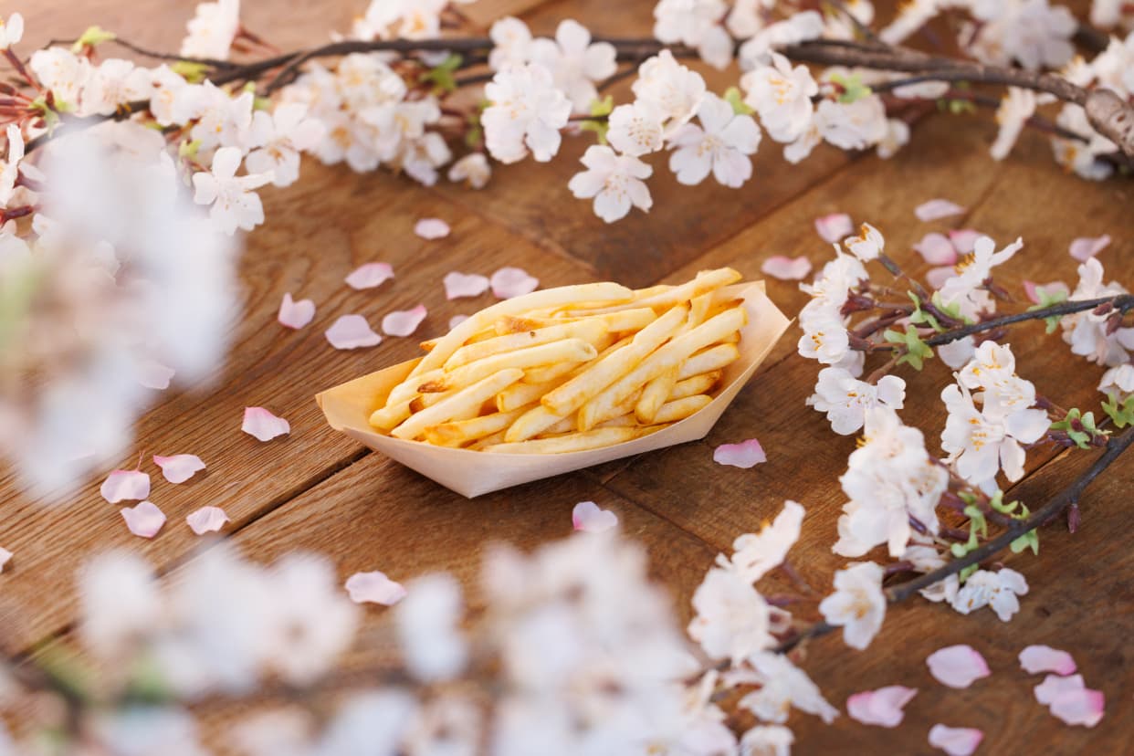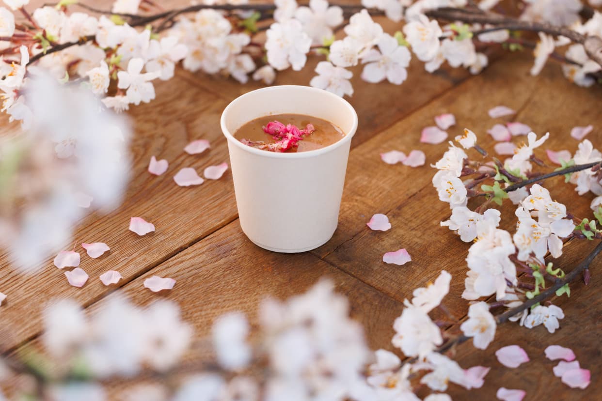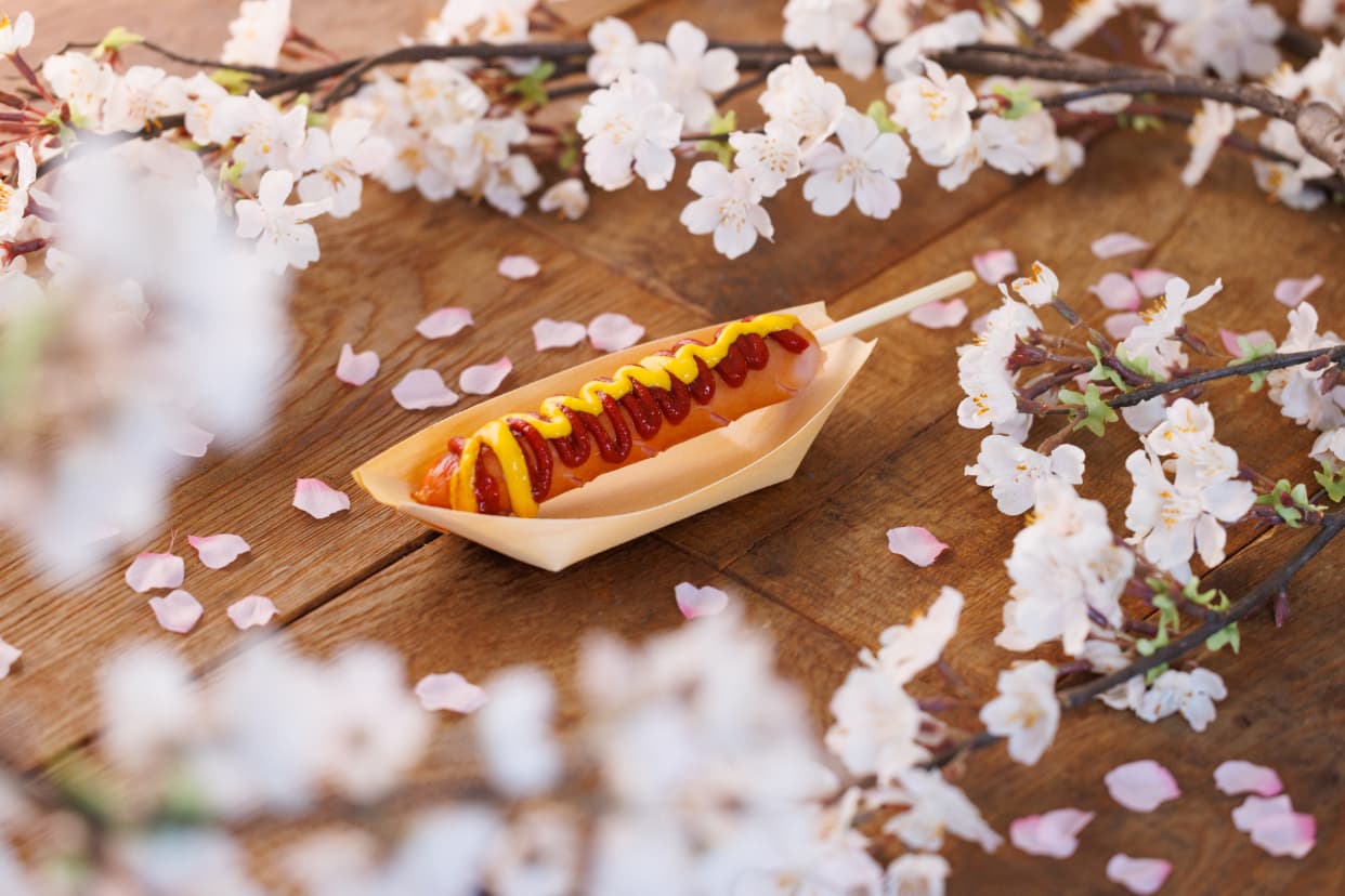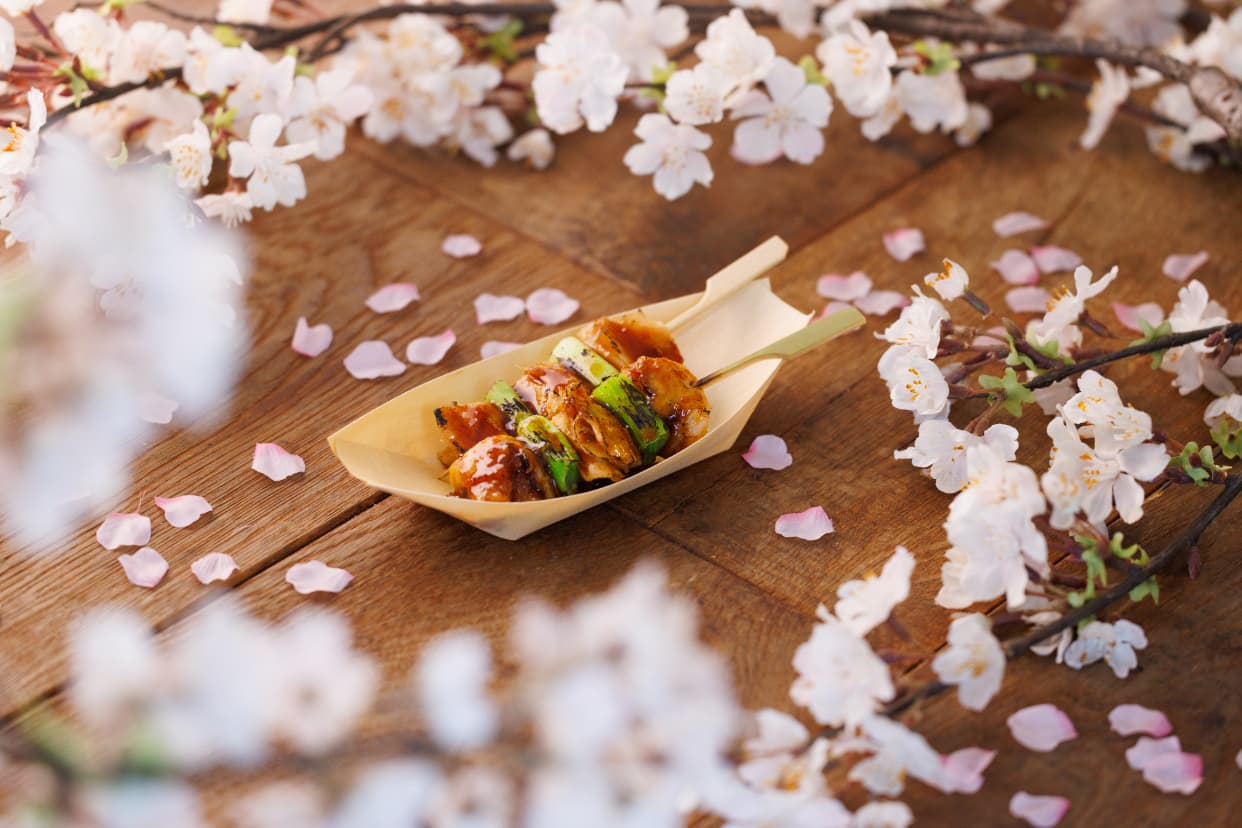南門エリアでは、桜をテーマにした軽食やドリンクを販売。ドリンクには「桜豆乳チャイ」、「桜レモネード」、南フードメニューでは、あたたかい「京風おでん」や、ソイミートと葱で出来た「Vegan焼き鳥」、スイーツには、桜のホイップが相性抜群のベビーカステラなど、多彩なラインナップでお花見気分を盛り上げます。