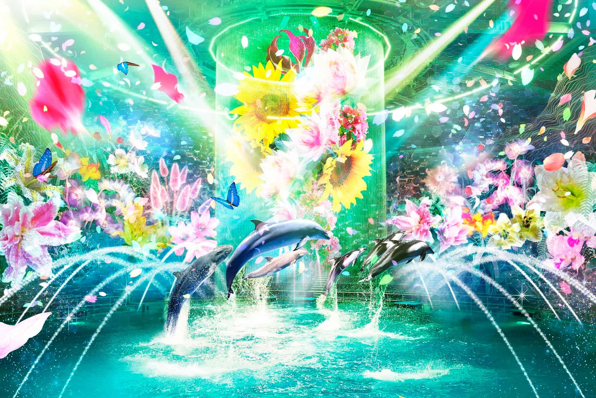 さらに、360度に広がる空間で繰り広げられるナイトドルフィンパフォーマンス「Beauty of Flower」では、光・花・水のアートと共鳴しながら、イルカたちがダイナミックなジャンプを披露。初夏の爽やかな世界観を全身で体感できます。都会の喧騒を忘れ、海の世界と花が創る幻想的な空間に包まれる、特別な初夏のひとときをお楽しみください。
