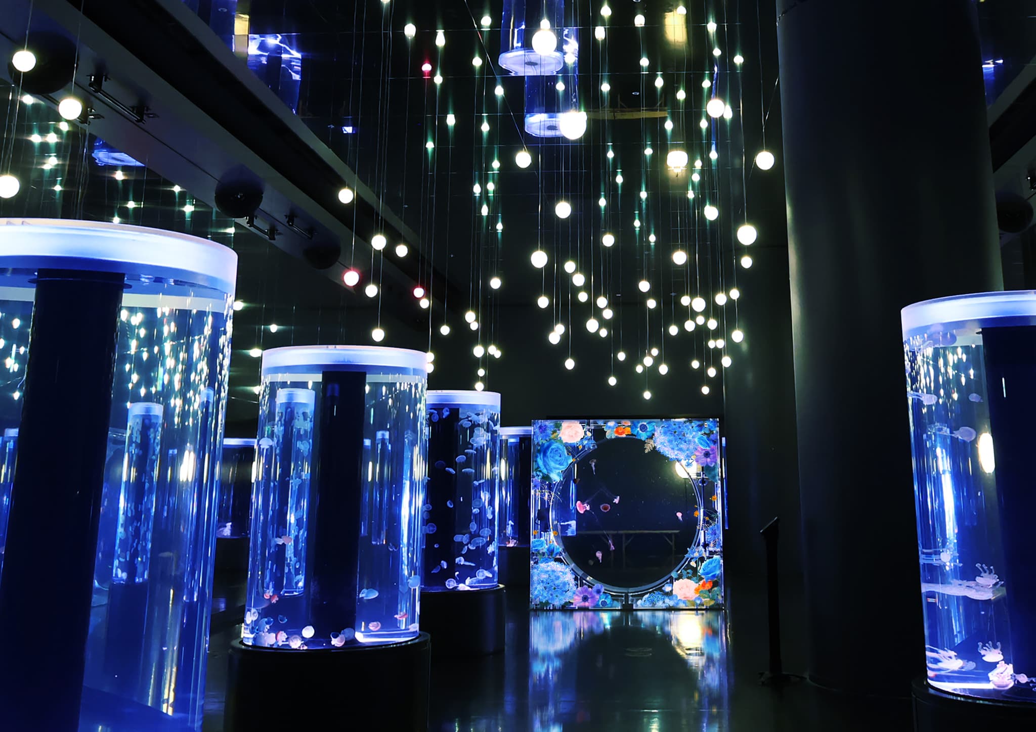 今回新たにネイキッドが装飾を手がけたクラゲエリア「Jellyfish Ramble」も、花びらが水面に舞う一瞬を閉じ込めたようなシンボリック水槽を中心に、光をまとったクラゲがゆったりと漂う神秘的な空間に。